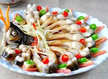 5、鱼切开的脊背,顺着自然的方向摆成花型,火腿和姜片插在间隔处,鱼头摆好,鱼尾切段摆在鱼头旁边。