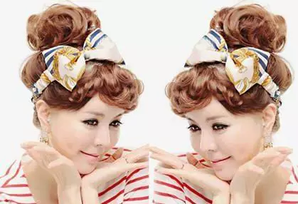 斜刘海与鬓角修颜,卷发蓬松扎起,搭配打成蝴蝶结的发带显甜美可爱。