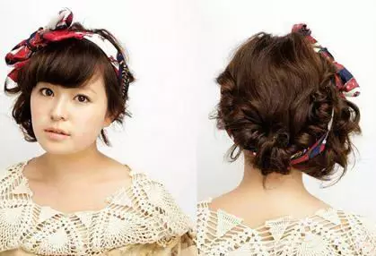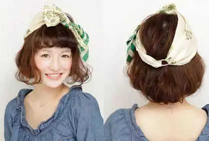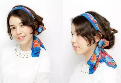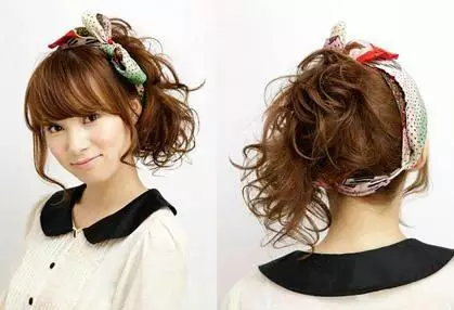 温暖的斜刘海搭配卷曲的鬓角修出小脸,松散的卷发显休闲,在用头巾在头上搭上俏皮结,增加可爱气息,打造起来简单方面,超级适合萌妹子们。