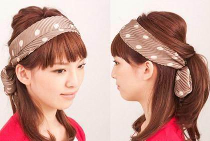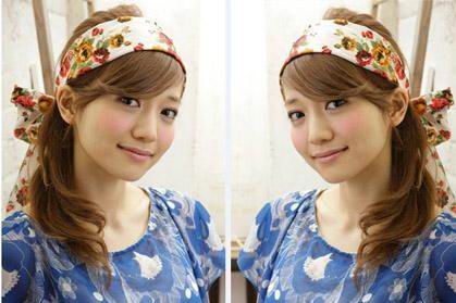 直发刘海及眼打造小脸,头发全部集中在侧边,两条头巾打个好看的结包裹头部,将头发扎成马尾,显得清新可人。