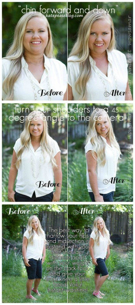 3. 凡是拍过艺术照和婚纱照的人都不会忘记摄影师不断高喊的那句:“下巴往前伸,微微低下头”;无敌显瘦大法:45度侧身对镜头;觉得自己下半身太粗壮,就在侧身面对镜头的同时重心放在后脚,在前面的膝盖微微弯曲