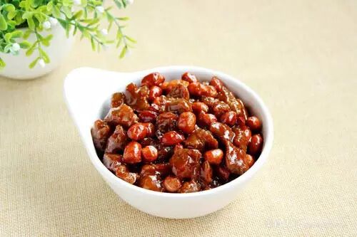 原料:牛肉750克、花生仁150克、油适量、盐少许、香辣烤肉酱适量
