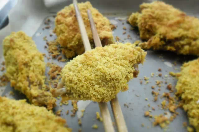 4.最后沾上面包糠。给鸡翅表面的面包糠刷油,这个不太好刷,不要介意会刷掉一些面包糠,刷油是为了让鸡翅表面更酥脆。