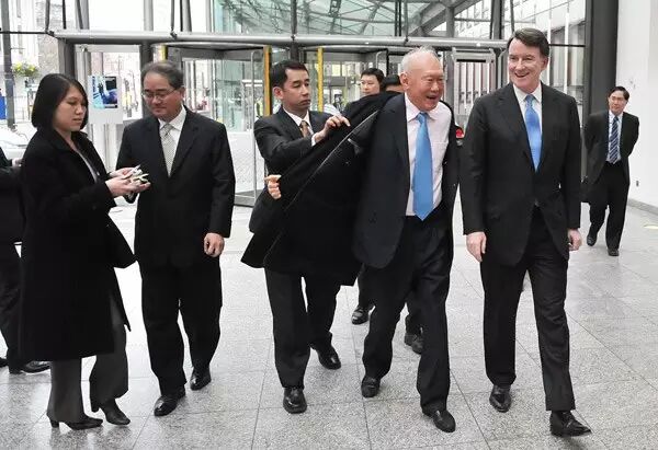 2010年3月10日,伦敦,李光耀与英国商务部长曼德尔森交谈。一旁的工作人员为他披上外套。