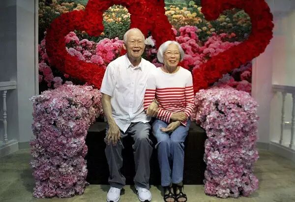 2015年2月5日,李光耀因感染严重肺炎入院,3月17日新加坡总理公署发表文告,称李光耀病情因感染而恶化。图为香港杜莎夫人蜡像馆内,李光耀与夫人柯玉芝的蜡像。