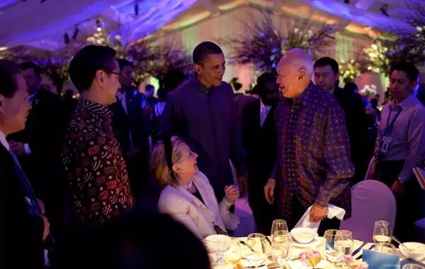 2009年11月14日,新加坡,亚太经合组织领导人晚宴上的李光耀、奥巴马和希拉里。
