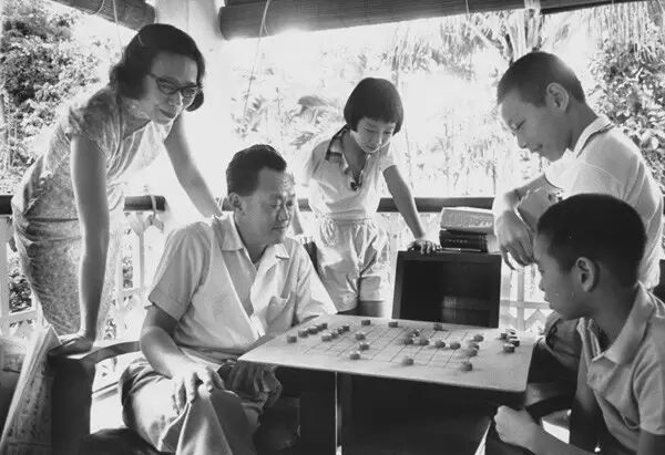 李光耀夫妇共育有三个子女:长子李显龙,次子李显扬,女儿李玮玲。图为李光耀与三个孩子在家中下象棋。