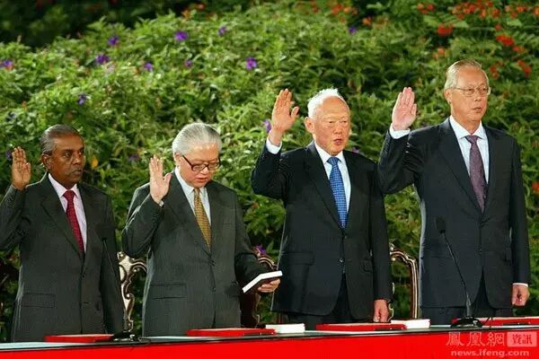 2004年8月12日,新加坡,李光耀(右二)宣誓就任内阁资政,吴作栋(右一)宣誓就任国务资政。