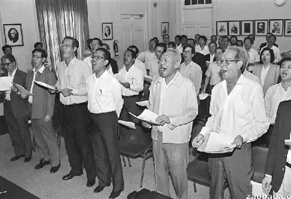 1987年7月28日,为了能熟练地在国庆日与群众同唱爱国歌曲,内阁部长(前排左起)陈庆炎、王鼎昌、吴作栋、麦马德、李光耀和巴克,特地抽空认真练唱。
