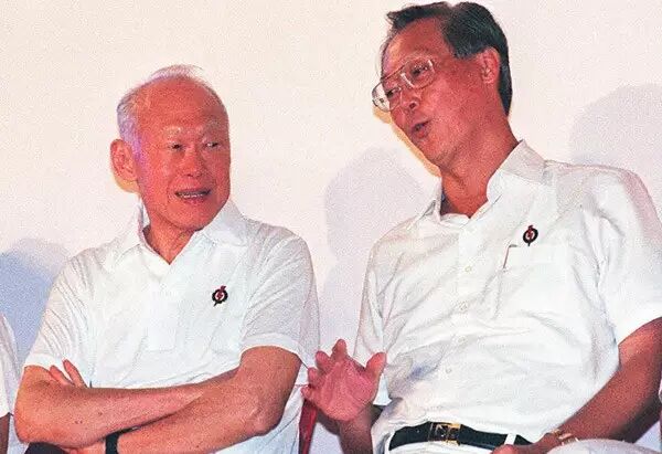 1996年12月22日,人民行动党的一次选举集会上,时任新加坡总理的吴作栋与李光耀交谈。吴作栋是继李光耀之后新加坡第二任总理。