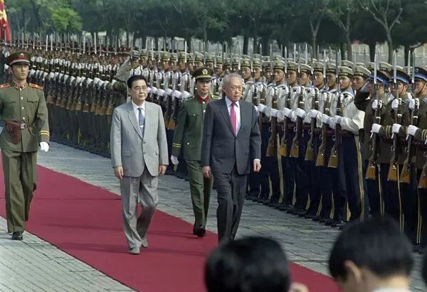 1988年期间,李光耀三度访华。图为9月15日,北京,李鹏与来访的李光耀检阅仪仗队。