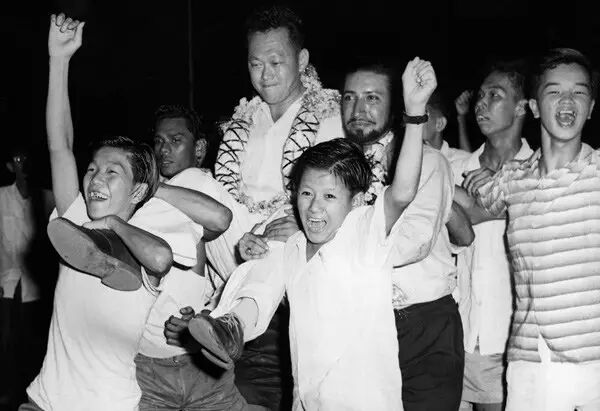 1959年,新加坡脱离英国殖民统治,成立自治邦。李光耀出任总理,自此开始他长达31年的总理生涯。图为1959年6月3日,李光耀赢得大选后,支持者齐集在政府大厦前大草场,李光耀举起拳头,带领群众大喊“Merdeka! Merdeka!”(自由!自由!)