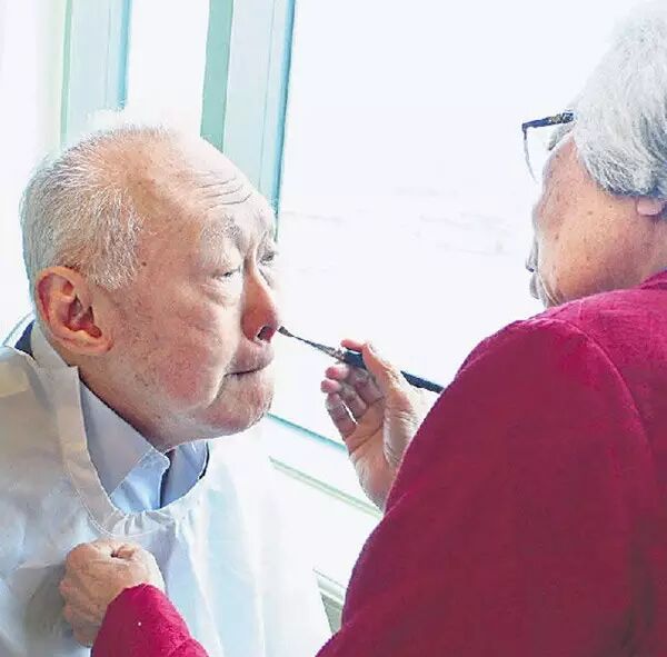2006年5月17日,浦东香格里拉酒店,李光耀准备接受上海某电视台录影,夫人亲自为他补妆。