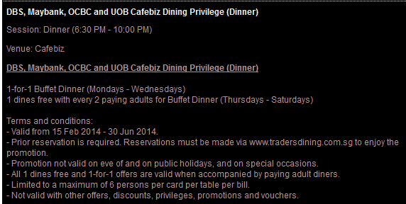 现正在举办促销活动,仅需用DBS,Maybank,OCBC或UOB信用卡规定时段付款,即可享受2人同行,1人免费优惠,十分有划算。